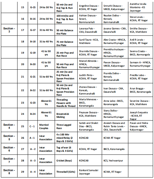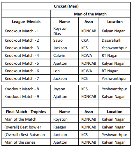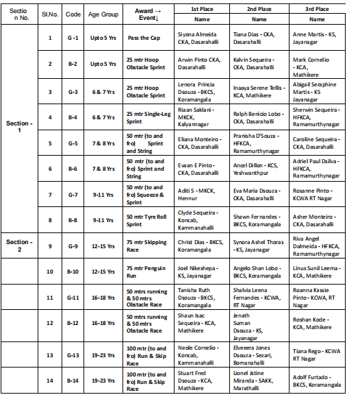 In the results, the Rolling Shield was won by Catholic Konkani Association, Dasarahalli. Below is the full list of winners: